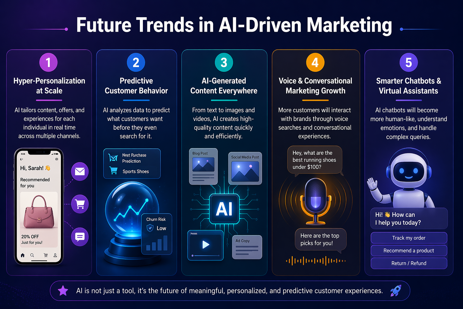 From blog posts to ad copy, videos, and images—AI tools will create high-quality content quickly. Human marketers will focus more on strategy and creativity rather than production.