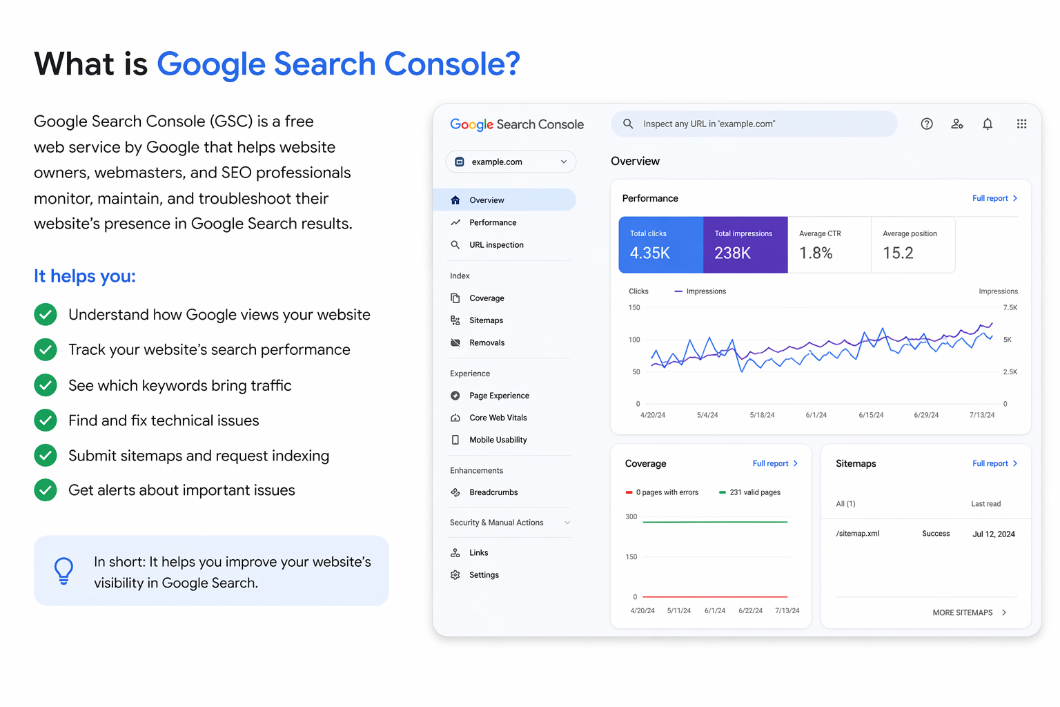 It shows how your website is performing, what keywords people use to find you, and what issues may be affecting your rankings.