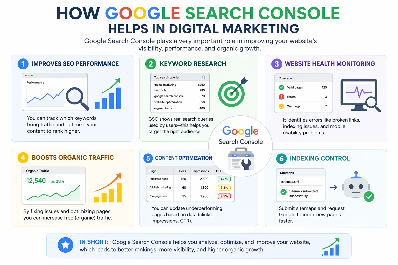 👉 In short: Google Search Console helps digital marketers analyze data, fix issues, and improve website ranking, making it a powerful SEO tool.